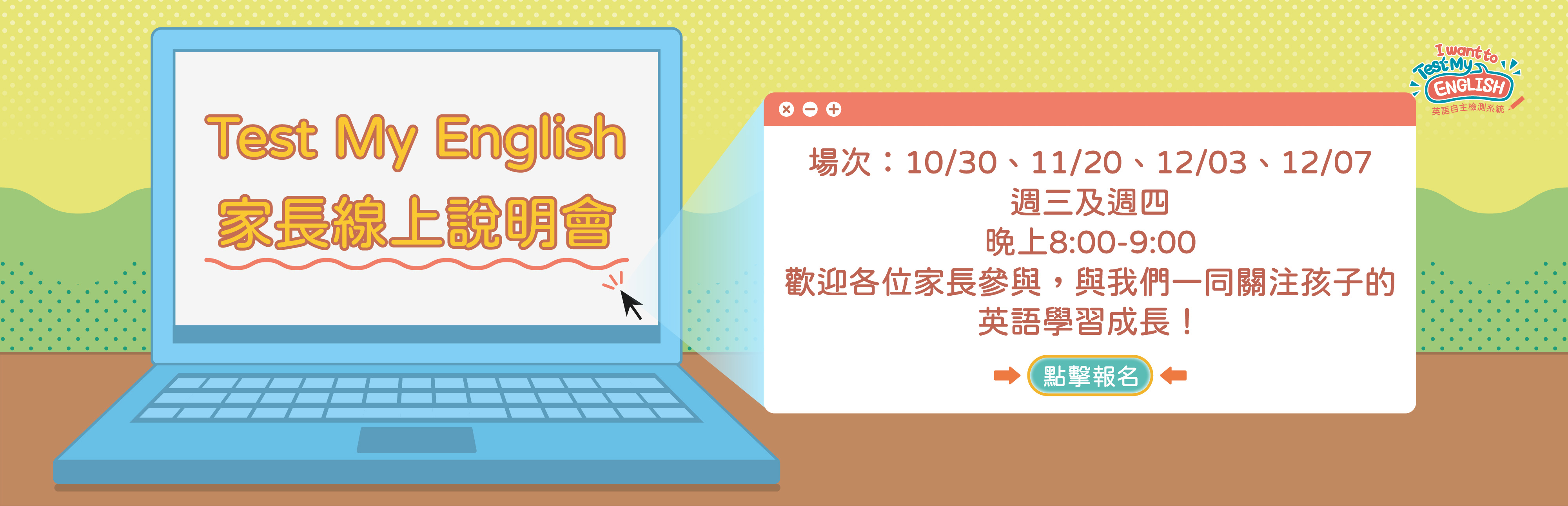 「I want to Test My English英語自主檢測系統」(以下簡稱Test My English英語自主檢測系統)的檢測,依國小四到六年級、國中一到二年級、國中三年級到高中一年級、高中二到三年級、大專各年級分為 Pre A1、A1、A2、B1、B2 五個級別,前四個級別均有字彙、聽力、閱讀、口說、寫作五項檢測, B2 則有聽力、閱讀、口說、寫作四項檢測。